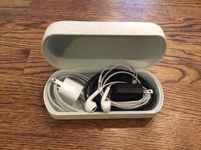 휴대폰 충전기를 찾기 위해 더이상 가방 밑바닥을 뒤적거리지 마시기 바랍니다. 충전이 필요한 다양한 전자 제품을 가지고 가는 여행을 계획할 때, 코드, 전선, 충전기를 넣을 오래된 안경이나 선글라스 케이스를 찾아보시기 바랍니다. 도착하자마자 더 이상의 엉킴과 충전기 분실은 없을 것입니다. 가족 여행이요? 다른 색깔의 안경 케이스를 몇 개 가져가면, 더 나아가 각 안경 케이스에 이름을 붙이거나 표시한다면, 누가 누구 것인지 알 수 있습니다.
